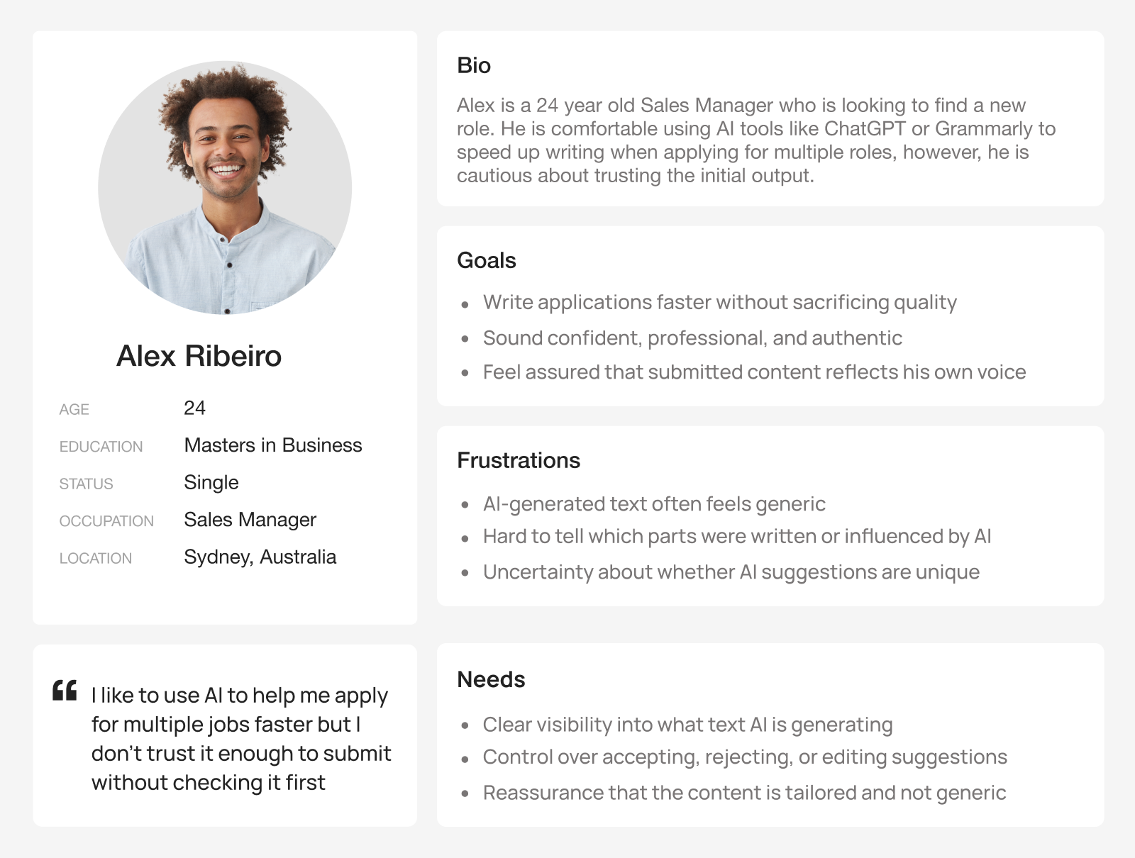 From the interviews, it was clear that job seekers don’t fully trust AI-written content without reviewing it first, often because it feels generic or not quite like them. Instead of wanting AI to write everything for them, users preferred staying in control and wanted more transparency into how AI comes up with its content.